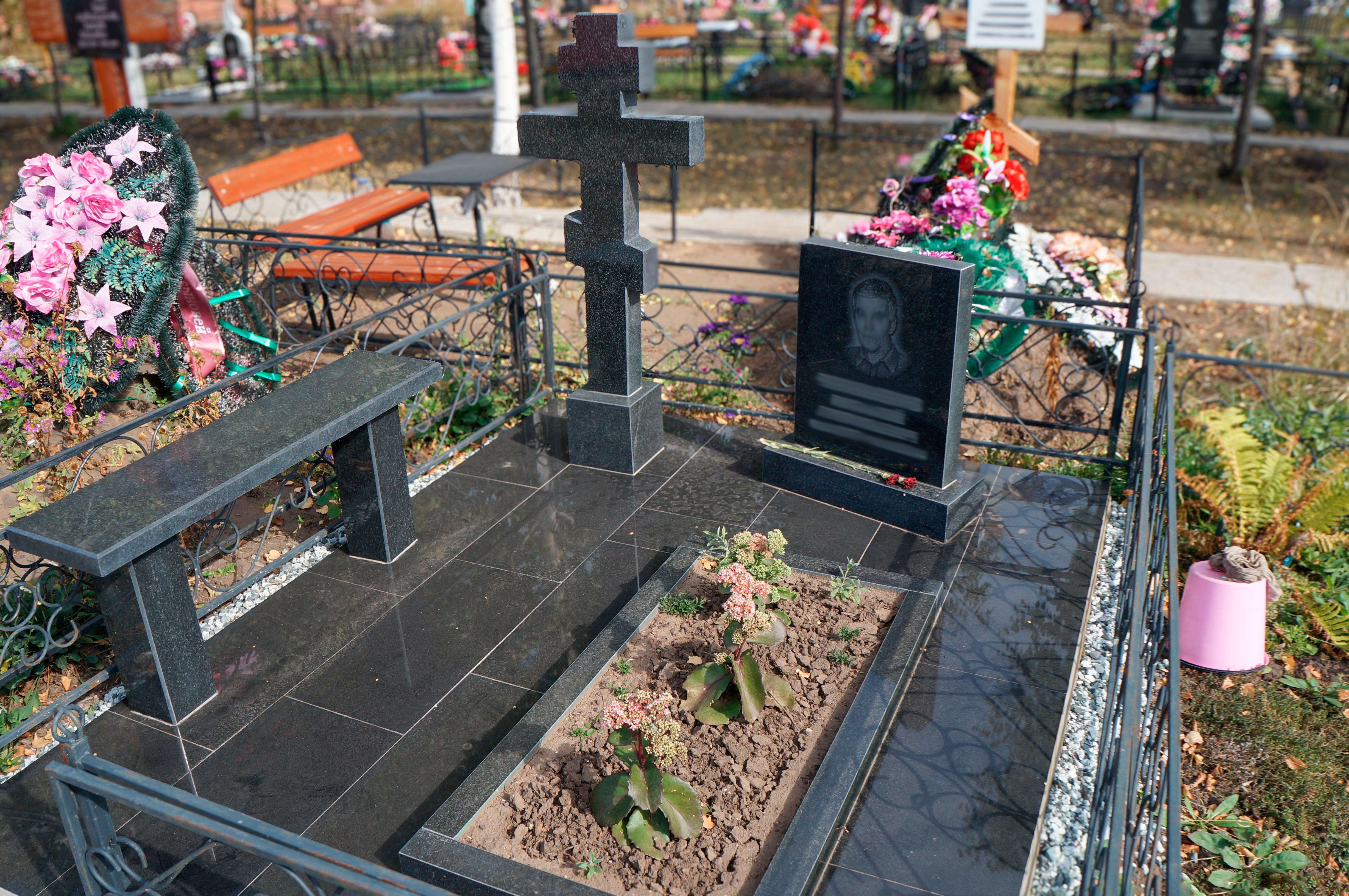 Работы охватывают монтаж гранитных или мраморных стел, тумб, плит, цветников, заливку фундамента, а также дополнительные элементы по вашему выбору — ограду, цоколь, плитку, лавки, вазы.